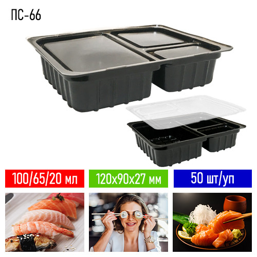 Упаковка для соусів ПС-66 - це комплект прозорої кришки й дна чорного. Головне призначення цих контейнерів - упаковка і транспортування суші та ролів, вірніше соуси до цих страв. Дана блістерна упаковка дуже зручна, практична і добре виконує свої завдання.